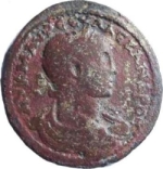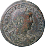 front view of temple with six columns with arcuated lintel, within which Mên(?) standing, left, wearing a Phrygian cap, holding spear(?) and uncertain object |