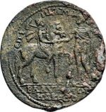 Reverse design Apollo-Mên on horseback, right, carrying double axe over shoulder, horse being led by Hermes standing left, holding caduceus