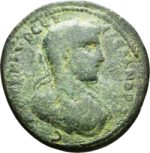 Asclepius and Homonoia standing face to face; Asclepius on left leans on staff entwined by serpent, and Homonoia on right holds patera in right and cornucopia in left |