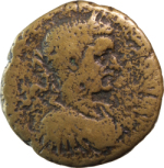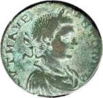 laureate, draped and cuirassed bust of Elagabalus, right, seen from front |