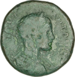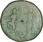 emperor in military dress standing, left, holding parazonium (?) and spear, placing foot on captive seated, right, with hands tied behind his back; behind, Nike standing, left, holding palm branch and crowning him with wreath; between them, another captive crouching with shield, right |