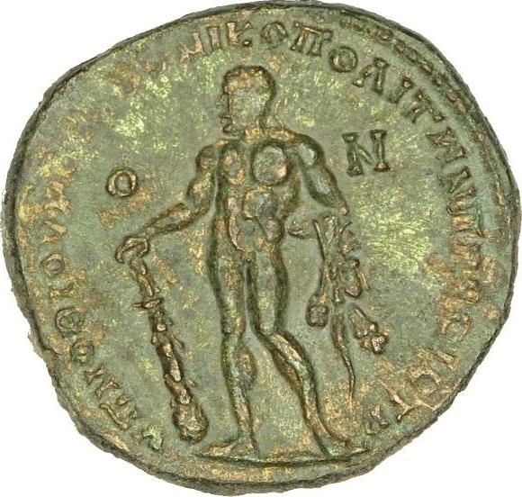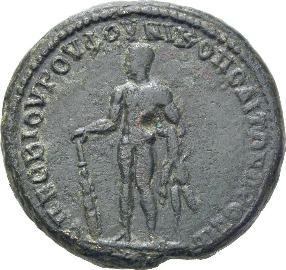 Heracles standing facing, head left, resting on club, holding lion skin |