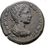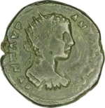 Nemesis standing facing, head left, holding scales and rod; at her feet, wheel |