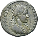 radiate, draped and cuirassed bust of Elagabalus, right, seen from front