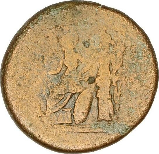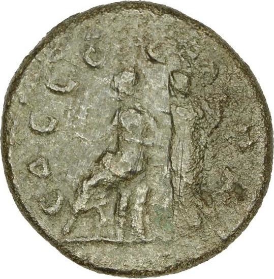 Roma goddess seated on throne, left, wearing helmet and holding Nike offering her a wreath; behind her, turreted Edessa standing, left, holding cornucopia and crowning her with wreath; at her feet, goat, right