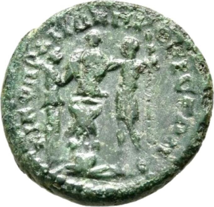 Nike standing, right, and the emperor standing facing, head left, resting on spear; between them, trophy with two captives seating at the base