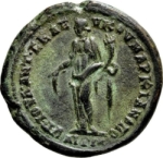Abundantia(?) standing facing, head left, holding ears of corn downwards and cornucopia |