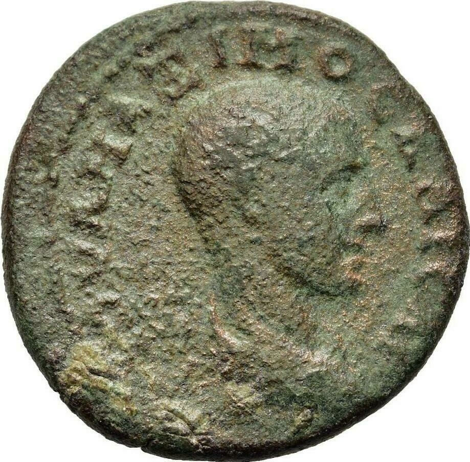 Roma goddess seated on throne, left, wearing helmet and holding Nike offering her a wreath; behind her, turreted Edessa standing, left, holding sceptre and crowning her with wreath
