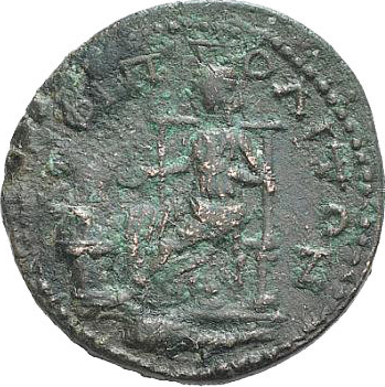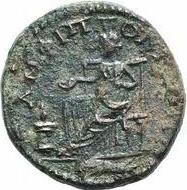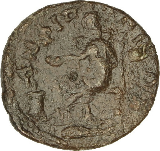 turreted Tyche seated on throne, left, holding patera over lighted altar; in exergue, fish, left