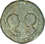 laureate, draped and cuirassed bust of Elagabalus, right, seen from rear, facing diademed and draped bust of Julia Maesa, left |