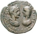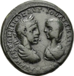 laureate, draped and cuirassed bust of Elagabalus, right, seen from rear, facing draped bust of Julia Maesa, left |