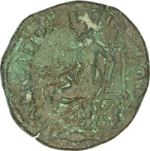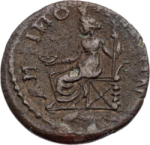 turreted Tyche seated on throne, left, holding patera and small sceptre; in exergue, fish, left