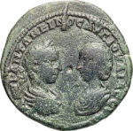 laureate, draped and cuirassed bust of Elagabalus, right, seen from rear, facing draped bust of Julia Soaemias, left |