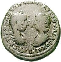 laureate, draped and cuirassed bust of Elagabalus, right, seen from rear, facing draped bust of Julia Soaemias, left |