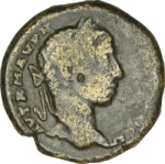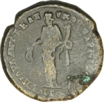 Abundantia(?) standing facing, head left, holding ears of corn downwards and cornucopia |