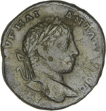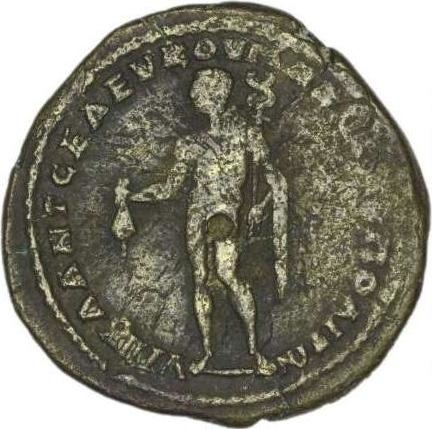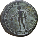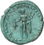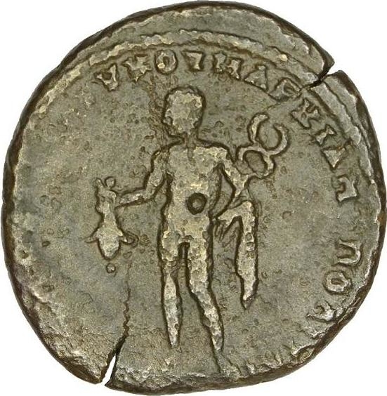 Hermes standing facing, head left, holding caduceus, purse and chlamys |