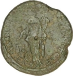 Nemesis-Dikaiosyne standing facing, head left, holding scales and cornucopia; (at her feet, wheel) |