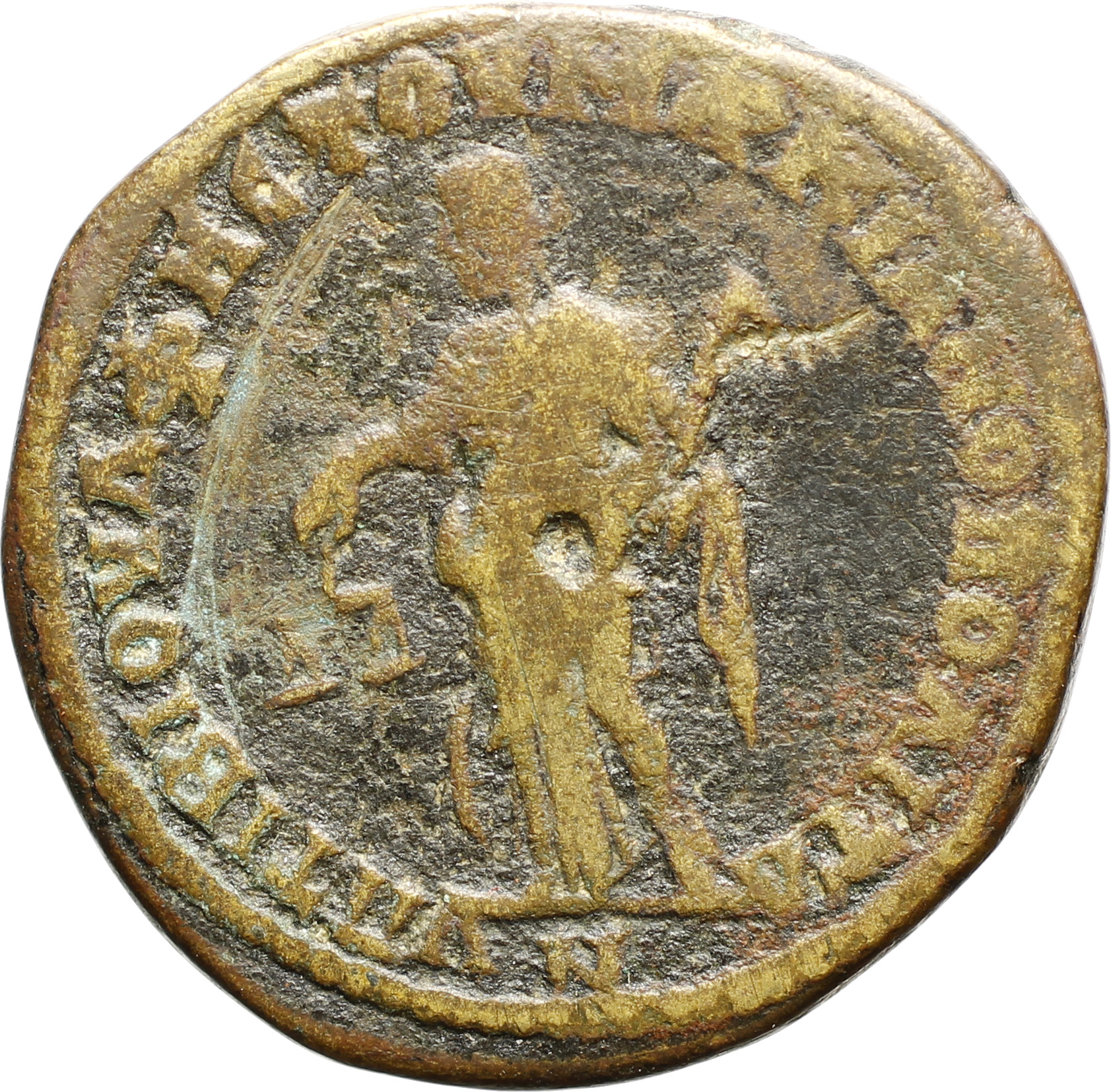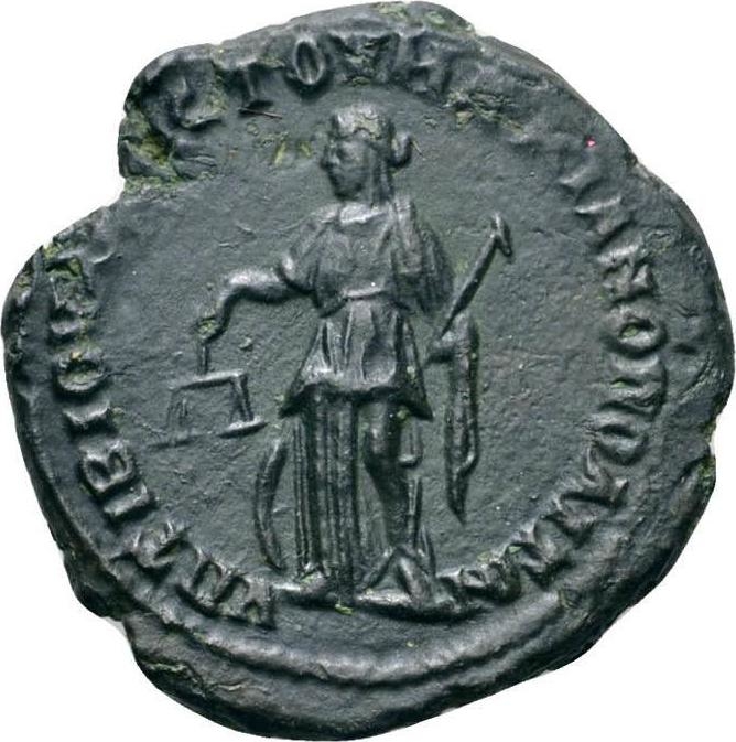 Nemesis standing, left, holding scales and rod; to left at her feet, wheel |