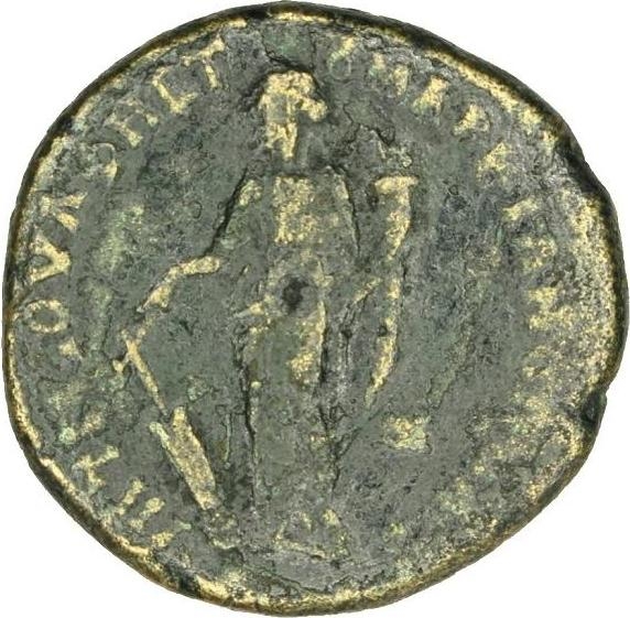 Tyche standing facing, head left, holding rudder and cornucopia |