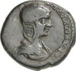 Tyche standing facing, head left, holding rudder on globe and cornucopia