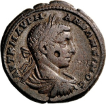 laureate, draped and cuirassed bust of Elagabalus, right, seen from rear