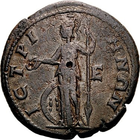 Athena standing, facing, head left, holding patera and resting on inverted spear; at her feet, shield