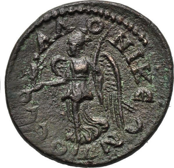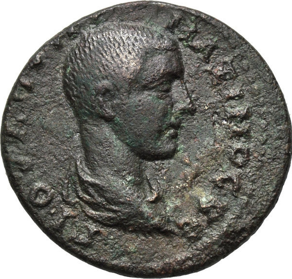bare-headed, draped and cuirassed bust of Maximus, right, seen from rear |