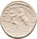 Alexander the Great standing, right, wearing chlamys, placing bridle on Bucephalus, rearing