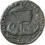 ship with sail, right, with helmsman and four rowers; on prow, standard(?) |