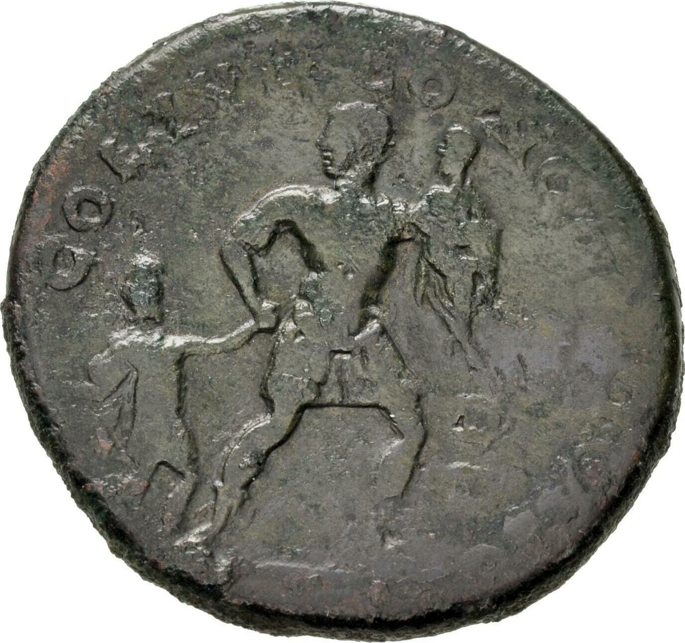 laureate bust of Severus Alexander, right, wearing cuirass decorated with Gorgon's head, seen from front |