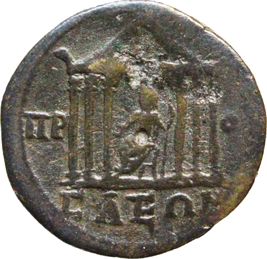 front view of temple with six columns, within which Zeus seated, left, holding sceptre and patera
