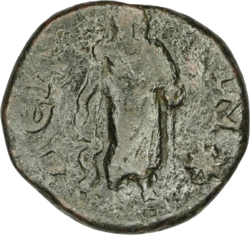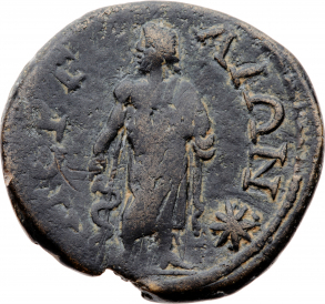 Asclepius standing facing, head right (?), holding serpent staff; to right, star