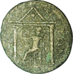 front view of a temple with two columns (pomegranate in pediment), within which Athena seated left, holding Nike and spear