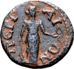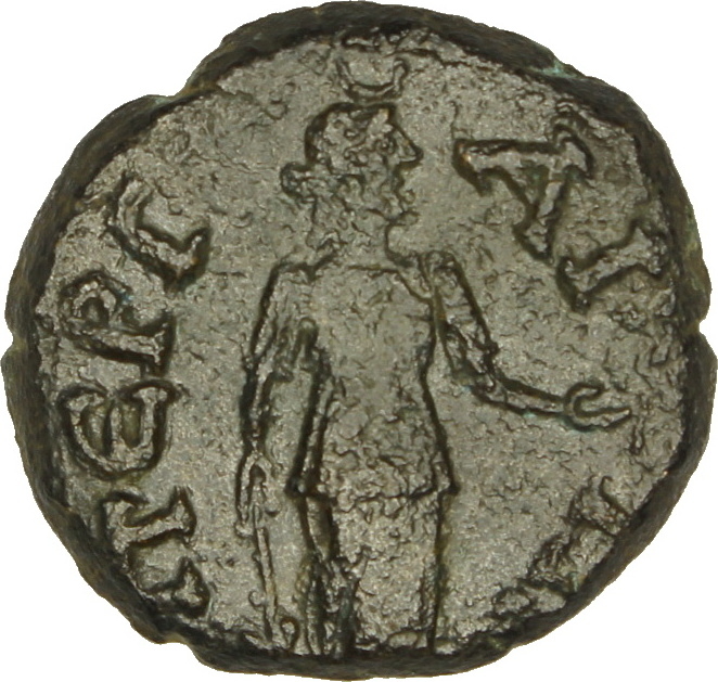 Artemis standing facing, head right, wearing crescent, holding bow and arrow