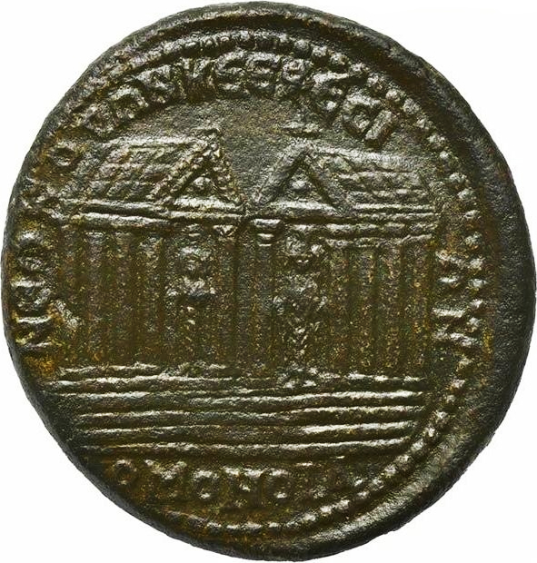 two temples with two columns seen in perspective, each holding cult-statue: Kore of Sardis (?) and Artemis of Ephesus (?)