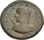 radiate, draped and cuirassed bust of Maximus, left, seen from rear, holding shield and spear