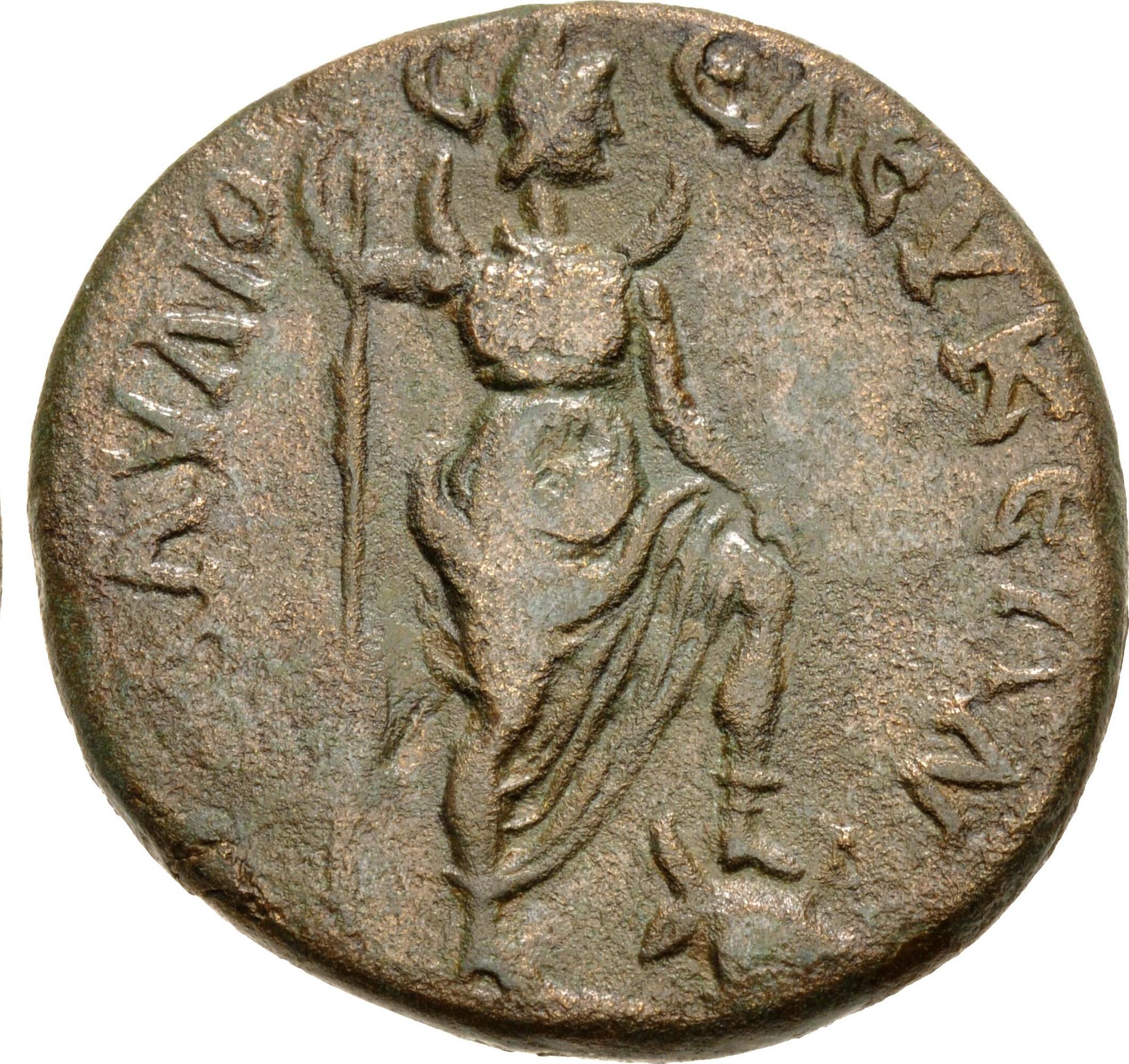 Mên standing facing, head right, wearing crescent on shoulders, resting on spear and placing foot on bucranium