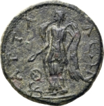 Nemesis, winged, standing facing, head left, holding patera; to left, wheel and griffin