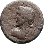 diademed and draped bust of Alexander the Great, left, with flowing hair, holding shield and spear