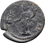 Tyche standing facing, head left, wearing kalathos, holding rudder and cornucopia