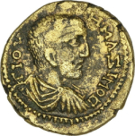 bare-headed, draped and cuirassed bust of Maximus, right, seen from rear