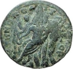 uncertain figure (male? female?) deity seated left, holding patera and uncertain object; to left, uncertain vertical object; to right, uncertain object (tree?)