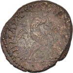 eagle standing facing, head right, holding wreath in beak; to left of eagle's head; uncertain object star between legs; in exergue, three dots