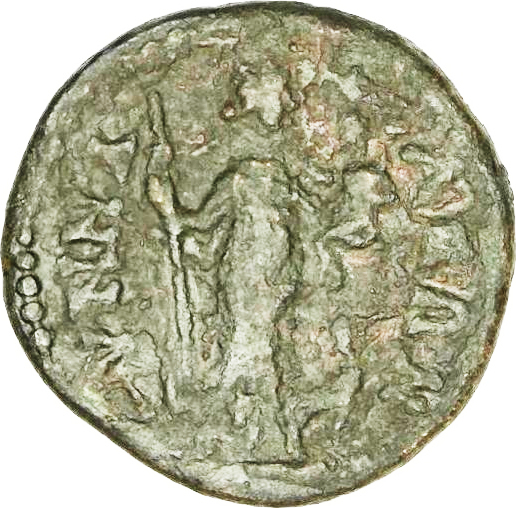 Amaltheia standing right, holding sceptre and infant Zeus; to right, at her feet, goat