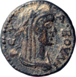 Tyche standing, left, wearing kalathos, holding rudder and cornucopia