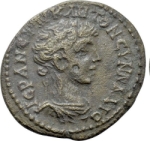 Mên standing, facing, head, left, wearing Phrygian cap, holding patera and long sceptre; behind his shoulders, crescent