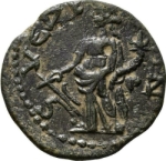 Tyche standing facing, head left, holding rudder and cornucopia