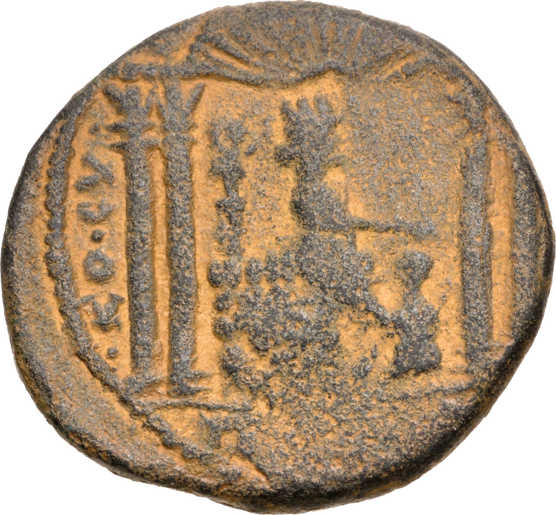 front view of temple with four columns with arcuated lintel decorated with shell pattern, within which Tyche seated, right, extending hand toward river god at her feet; behind, small Nike standing on column, crowning her with wreath