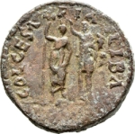 Astarte standing, facing, wearing kalathos, resting on long sceptre, crowned by military figure standing, left