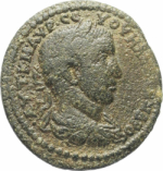 Zeus seated left, holding small cult-statue (xoanon of Artemis of Neapolis) and sceptre |